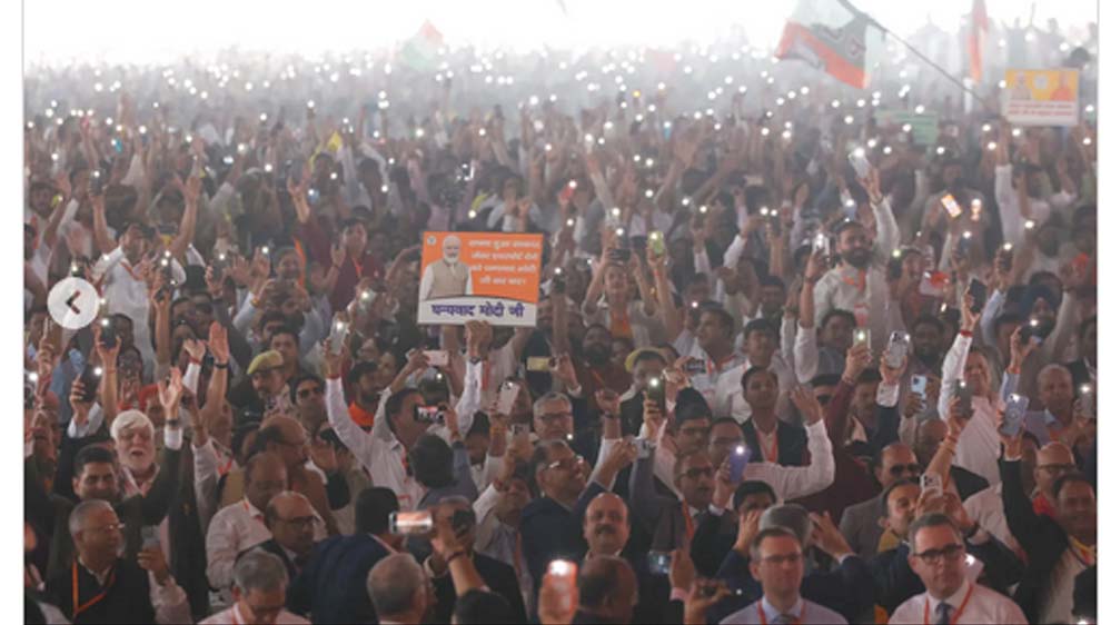 जैसे ही पीएम मोदी के साथ सीएम योगी मंच पर पहुंचे, पूरा परिसर अपार जनसमूह की तालियों और नारों से गुंजायमान हो उठा। युवाओं व महिलाओं के हाथों में प्रधानमंत्री मोदी और मुख्यमंत्री योगी आदित्यनाथ की तस्वीरों वाले पोस्टर लहरा रहे थे। भारी संख्या में लोग राष्ट्रीय ध्वज लेकर भी पहुंचे थे। पीएम और सीएम की तस्वीरों के कटआउट जनसभा को जीवंत बना रहे थे। प्रधानमंत्री मोदी के आह्वान पर पंडाल में हजारों मोबाइल फोन की फ्लैश लाइट मानो उत्तर प्रदेश के चमकते भविष्य की झलक दिखा रही थी।