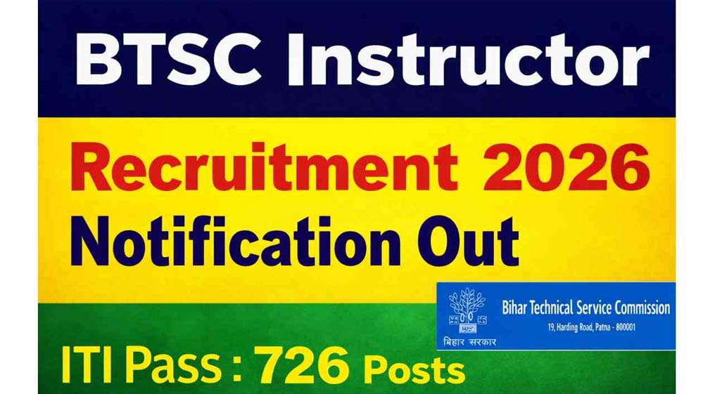 बिहार तकनीकी सेवा आयोग (बीटीएससी) ने इंस्ट्रक्टर (प्रशिक्षक) के विभिन्न 726 पदों पर भर्ती के लिए एक आधिकारिक अधिसूचना जारी की है। इन पदों के लिए ऑनलाइन माध्यम से आवेदन प्रक्रिया 15 अप्रैल से शुरू हो गई है और अप्लाई करने की अंतिम तिथि 15 मई निर्धारित की गई है। ऐसे में जो योग्य और इच्छुक उम्मीदवार एप्लीकेशन फॉर्म भरना चाहते हैं, उन्हें आधिकारिक वेबसाइट पर जाकर तय लास्ट डेट तक या उससे पहले अपना रजिस्ट्रेशन फॉर्म जमा करना होगा।
