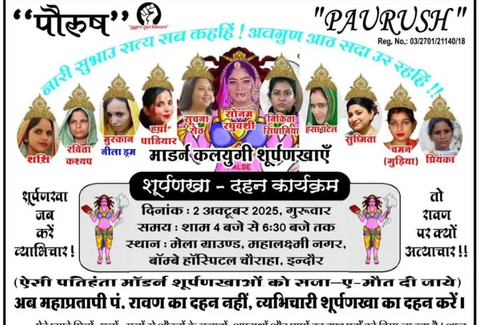 बीते दिन पौरुष नामक संस्था द्वारा ऐलान किया गया था कि इस दशहरा पर इंदौर महालक्ष्मी नगर मेला ग्राउंड में उन महिलाओं या युवतियों की पुतला दहन किया जाएगा, जिनके ऊपर हाल में अपने पति या प्रेमी की नृशंस तरीके से हत्या का आरोप लगा है. इसमें राजा रघुवंशी की शिलांग में हत्या के आरोप में जेल में बंद सोनम रघुवंशी भी शामिल थीं. साथ ही मेरठ के चर्चित नीले ड्रम हत्याकांड की आरोपी मुस्कान रस्तोगी सहित कुल 11 महिलाएं शामिल थीं. इस पुतला दहन को 'शूर्पणखा दहन' का नाम दिया गया था. इसमें सोनम को शूर्पणखा दिखाया जाना था.