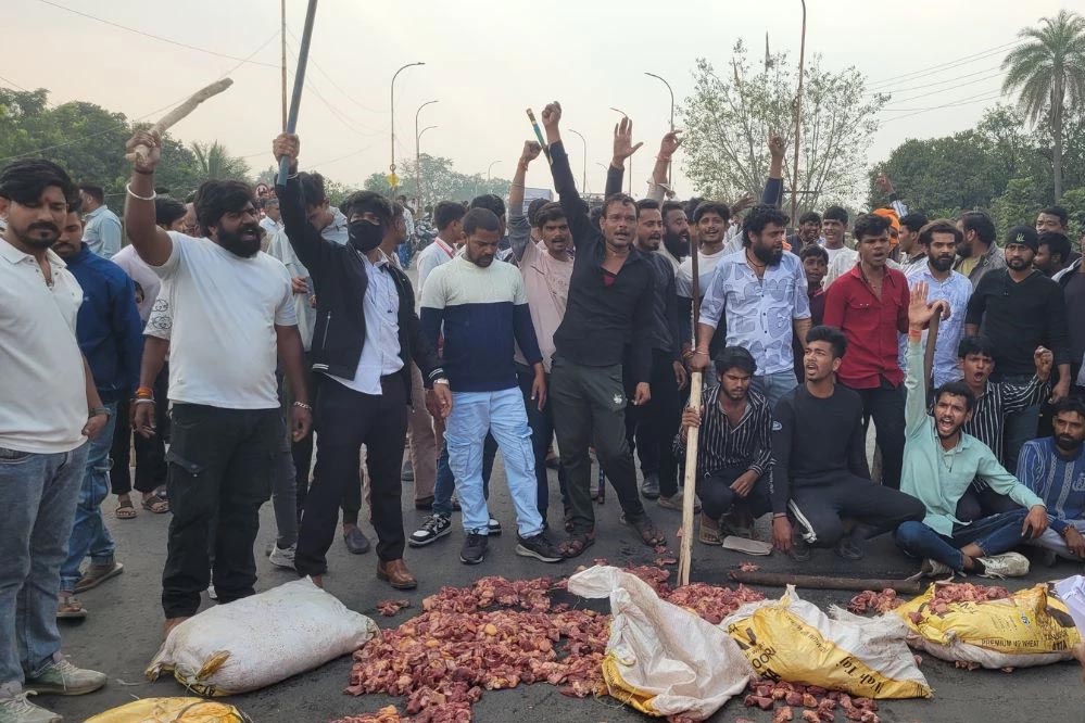 गोमांस को सड़क पर रख कर जाम किया रास्ता