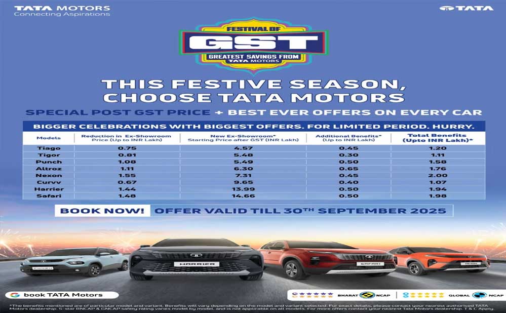 गुड्स एंड सर्विस टैक्स (GST) रिफॉर्म की चर्चा चारो ओर रही है. डेली लाइफ में इस्तेमाल होने वाली कई चीजों की कीमत में भारी कटौती देखने को मिल रही है. लेकिन इस वक्त सबसे ज़्यादा चर्चा जिस ऑफर की हो रही है, वह टाटा मोटर्स का ‘फेस्टिवल ऑफ GST’ कैंपेन. GST 2.0 लागू होने के बाद कंपनी ने जिस आक्रामक अंदाज़ में दाम घटाए हैं और ऊपर से त्योहारों का तड़का लगाया है, वह ग्राहकों के लिए ऐतिहासिक साबित हो सकता है.