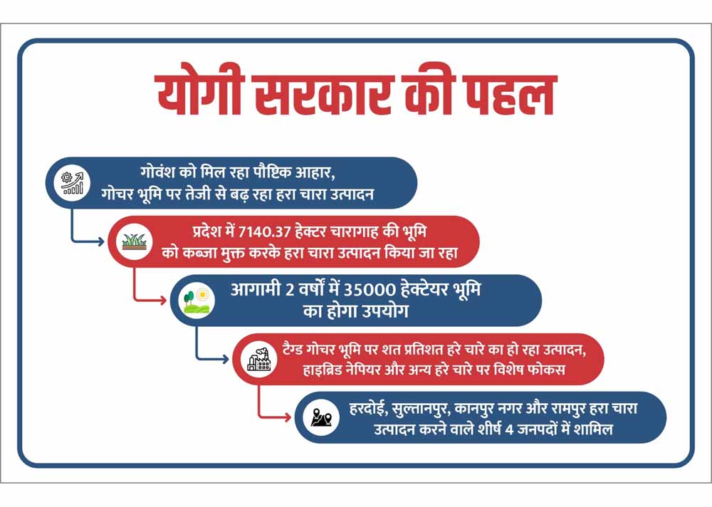 योगी सरकार ने भविष्य की जरूरतों को ध्यान में रखते हुए एक बड़ा लक्ष्य तय किया है। आने वाले दो वर्षों में 35000 हेक्टेयर कब्जामुक्त एवं सिंचित चारागाह भूमि पर हरा चारा उत्पादन कराया जाएगा। इसके लिए योजनाबद्ध तरीके से कार्य किया जा रहा है। पशुपालन विभाग के प्रमुख सचिव मुकेश मेश्राम ने बताया कि प्रदेश में 1691.78 हेक्टेयर क्षेत्र में हाइब्रिड नेपियर चारा और 5448.59 हेक्टेयर में अन्य हरे चारे (जई, बरसीम आदि) की बुआई की जा चुकी है। इससे गोवंश को सालभर पौष्टिक और संतुलित आहार उपलब्ध हो सकेगा।